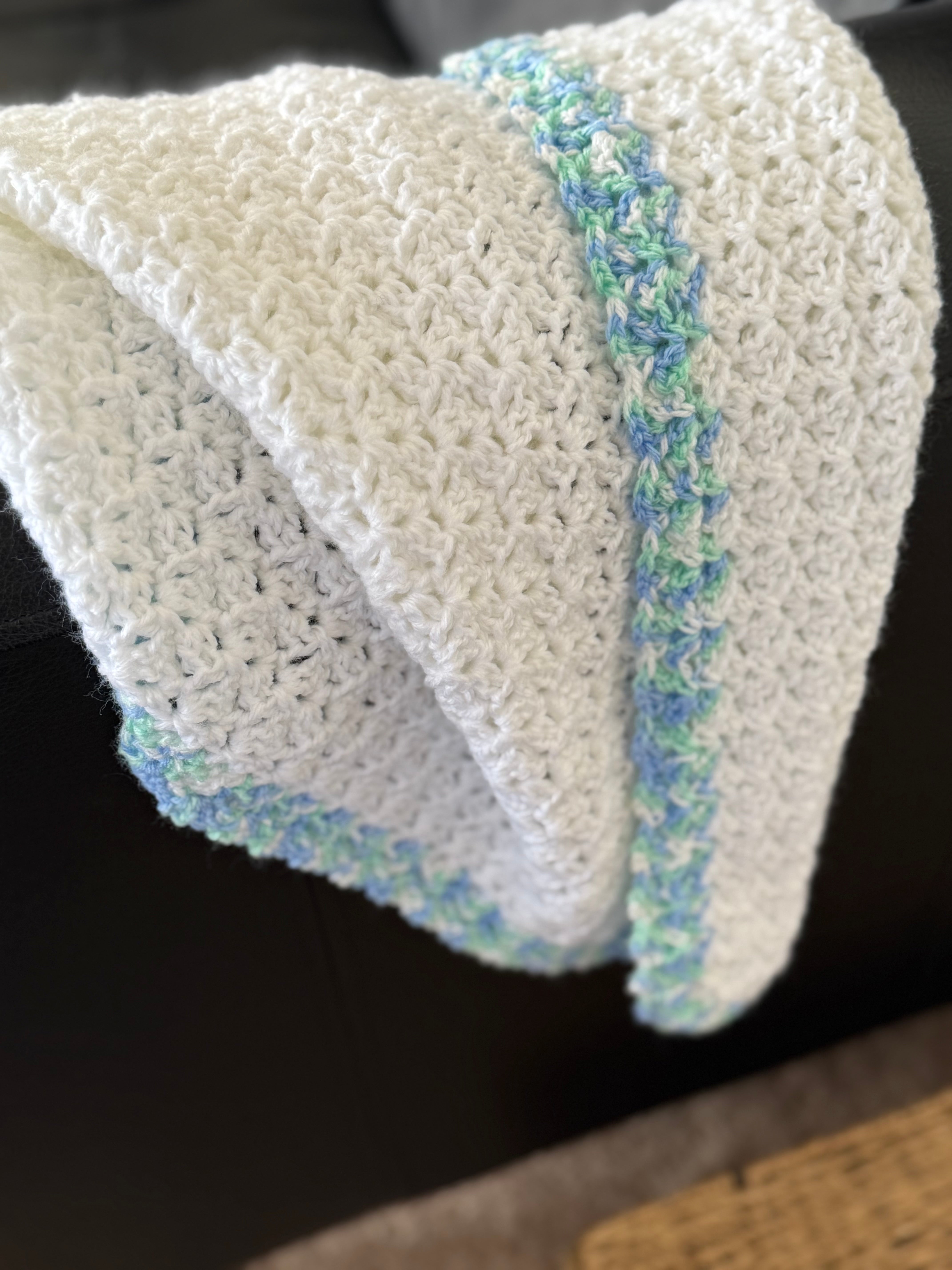 Crochet blanket - white with blue border is backordered and will ship as soon as it is back in stock.